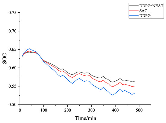 Estimation of SOC states under three algorithms by Equation (6). From Figure 9, the results show that the SOC value of DDPG-NEAT is maximum 0.6426 and minimum 0.5611; the SOC value of SAC is maximum 0.6452 and minimum 0.5486; and the SOC value of DDPG is the maximum of 0.6519 and minimum of 0.5257. The results show that the DDPG-NEAT algorithm exhibits less fluctuating situations compared to the other two algorithms of SOC, implying it has more efficient energy management, which can dynamically adjust the energy storage and release according to the demand, and reduces the energy waste.