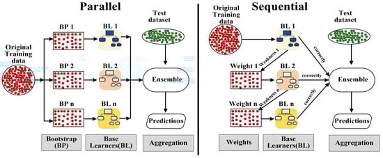 Thus, multiple base learning algorithms of the same type are trained separately on the generated subsets. Then, the outputs of the base learners are aggregated to calculate overall prediction values (Figure 1). In the sequential ensembles, the training process of base learners is carried out iteratively, with each base learner depending on the information provided by the previous learners; as a result, base learners learn from the errors of previous iterations by increasing the importance of incorrectly predicted training instances in future iterations [24].