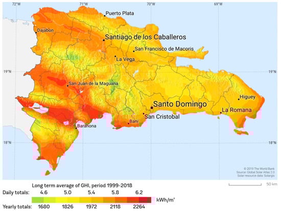 - The World Bank (2020)-Source: Global Solar Atlas 2.0-Solar Resource Data: Solargis. Solar Resource Maps of Dominican Republic. Available online: https://solargis.com/maps-and-gis-data/download/dominican-republic (accessed on 6 June 2024).