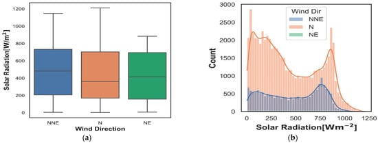 Exploratory data analysis (EDA) was conducted to examine the characteristics of the dataset resulting from the cleaning process. In general, the wind blows from the the north (N), northeast (NE), and north–northeast (NNE) directions, with an average wind speed of 2.18 m/s, an average outdoor air temperature of 26.93 Celsius, and a relative humidity of 76%. Solar radiation showed an average value of 436.85 W/m2, a maximum value of 1211 W/m2, and a minimum value of 5 W/m2. Most of the solar radiation values were collected when the wind direction was from the north, as can be seen in Figure 5a,b. The north and northeast wind directions were associated with the highest and lowest variability in the solar radiation values, respectively (Figure 5a). In Figure 5a, it can be noted that the median and interquartile range of solar radiation exhibited similar values in the north–northeast and northeast directions, while the northeast wind direction shows the most compact distribution.
