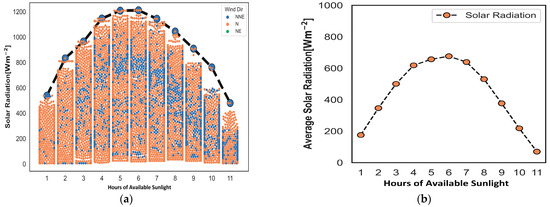 The distribution of solar radiation by wind directions for the range of daily sun hours is shown in Figure 6a. As can be seen, a line connects the maximum radiation values for each hour, resulting in a figure of merit for evaluating solar radiation behavior. Approximately 75.67% of the solar radiation measurements were captured when the wind was blowing from the north(N) direction, 23.75% corresponded to the north–northeast (NNE) wind direction, and only 0.09% were taken in the northeast (NE) wind direction. The solar radiation observations are distributed by hours as follows: 55% of the solar radiation values were scattered in a time range from 10:30 a.m. to 4:30 p.m. (from the 4th to the 9th hour), and 18% of the solar radiation points were captured during the first and last hours of the daily solar sample. The average values of solar radiation by daily sun hours are shown in Figure 6b. The trend in the figure indicates that the maximum average value of solar radiation was obtained from 12:30 p.m. to 1:30 p.m. (the 6th hour of the daily solar sample), with a value of 676.45 W/m2, while the minimum value was obtained at sunset (the 11th hour of the daily solar sample, 5:30 p.m–6:30 p.m.).