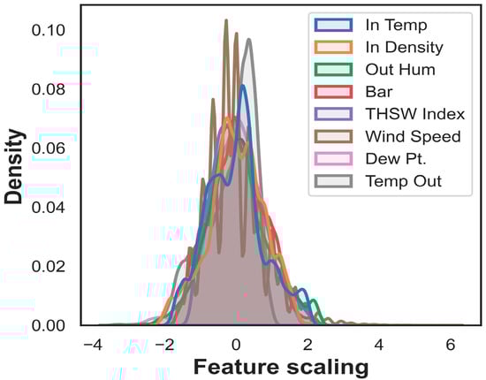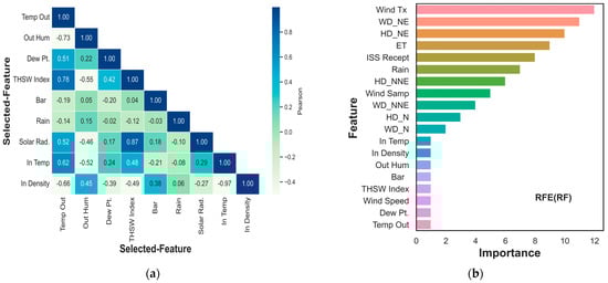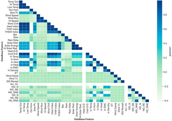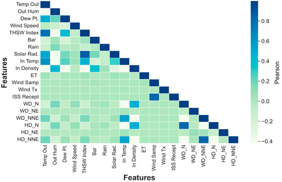 - In Figure 7, pairs of correlated input predictor parameters can be identified based on correlation coefficient values higher than 0.8 or lower than −0.8 (indicating collinearity); Wind Chill, Heat Index, THW Index, and Cool D-D are each separately correlated with Temp Out. Wind run is associated with wind speed; EMC is related to In Hum. In Hum and In Temp are correlated, as are In Dew and Dew Pt. Rain is correlated with rain rate. Additionally, there is a strong linear correlation between many measured meteorological parameters and the high (Hi) and low (Low) registered values corresponding to each parameter. This effect could be because a small timeframe was set for updating the DAQ lecture (1 min/lecture). Therefore, for many parameters, the high–lows and many measured values registered do not differ. As a consequence, the following input predictor parameters were deleted from the dataset to prevent the propagation of collinearity during the subset feature selection process and to avoid possible bias in the technical evaluation metrics: Wind Chill, Heat Index, THW Index, Cool D-D, Wind Speed, In EMC, In Hum, In Dew, Rain Rate, Hi Temp, Low Temp, Hi Speed, and Hi Solar Rad. (stored high and low values).