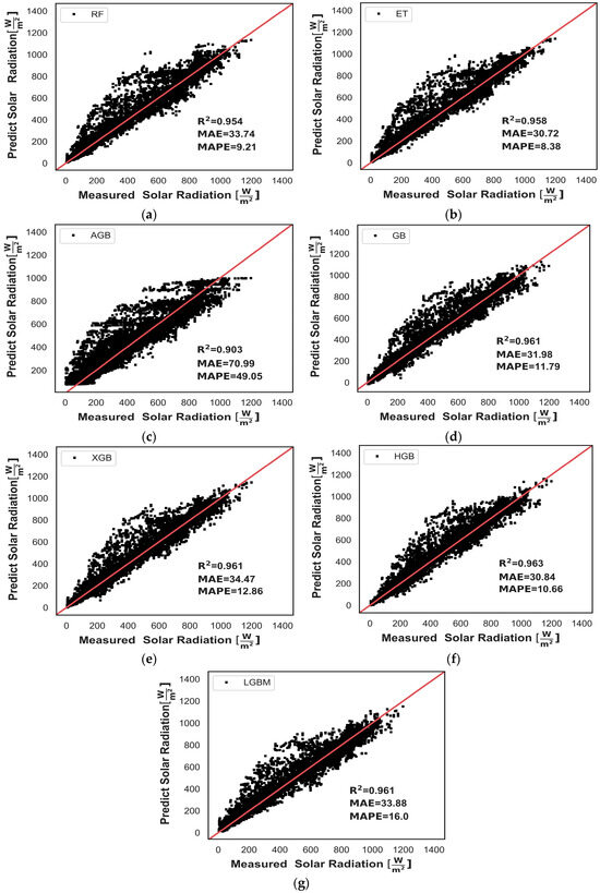 Comparison between measured and predicted values solar radiation values with seven homogeneous ensemble learning; (a) RF; (b) ET; (c) XGB; (d) GB; (e) AGB; (f) HGB; (g) LGBM.
