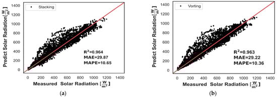 The comparison of predicted versus measured solar radiation for voting and stacking is illustrated in Figure 12a,b. Overall, stacking offers superior predictive ability compared to voting.