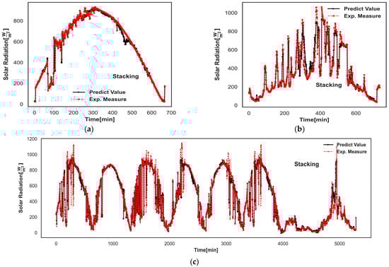 The first scenario, shown in Figure 13a, demonstrates that the stacking algorithm efficiently tracks the measured solar radiation trend. In the second scenario (Figure 13b), stacking works effectively for predicting the fluctuations associated with a day with poor solar resource availability. Finally, in the mixed scenario (Figure 13c), stacking successfully captures all possible behaviors of solar radiation.