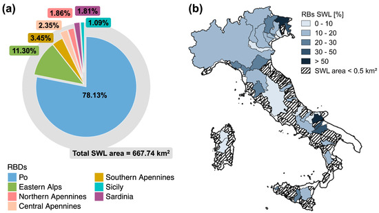 SWL hotspots across the RBDs and RBs in Italy. (a) The total extent of SWL in Italy and its overall distribution across the 7 RBDs; (b) SWL as a fraction of the surface water extent in 1984 across RBs. Values are shown only for RBs with an SWL area ≥ 0.5 km2.
