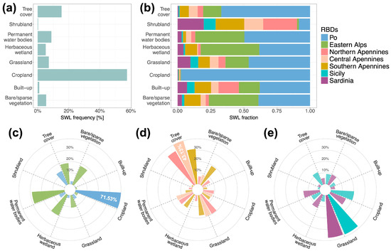 Land cover conversion in SWL hotspots. (a) The frequency of SWL hotspots in Italy across land cover classes. (b) The distribution of SWL hotspots converted into each land cover class across RBDs. The conversion of SWL hotspots into land cover classes within (c) Po and Eastern Alps RBDs; (d) Northern, Central, and Southern Apennines RBDs; and (e) Sicily and Sardinia RBDs.