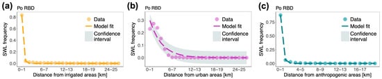 The frequency of the occurrence of SWL hotspots as a function of distance from areas of human pressure and SWL-DD model fit across the Po RBD. Confidence intervals are the standard errors associated with the model fit. Model application with respect to (a) irrigated areas; (b) built-up areas; (c) anthropogenic areas. The results for the other RBDs are reported in Figure A1.