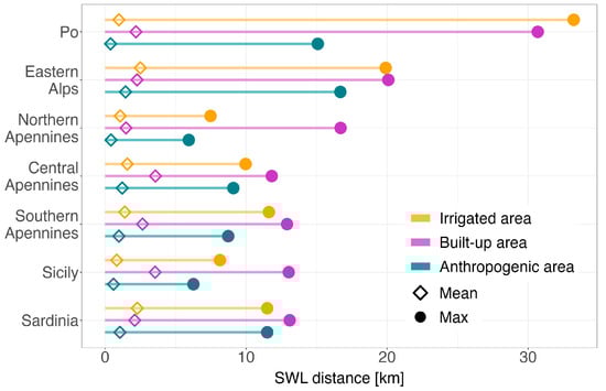The observed mean and maximum distance of SWL hotspots from irrigated, built-up, and anthropogenic areas in each RBD across Italy.