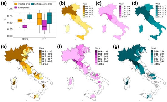 The distribution of α values with respect to different areas of human pressure across Italian RBDs and RBs. (a) The boxplot distribution of α values, where horizontal lines show the 1st, 2nd, and 3rd quartile. The spatial distribution of α values across RBDs with respect to (b) irrigated areas; (c) built-up areas; (d) anthropogenic areas. (e–g) The same as in the panels (b–d) but for RBs. The model is not applied to RBs in gray.