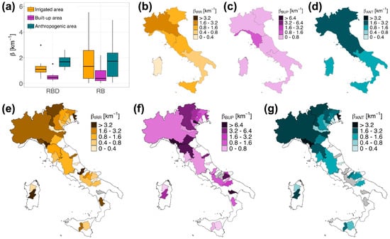 The distribution of β values with respect to different areas of human pressure across Italian RBDs and RBs. (a) The boxplot distribution of β values, where horizontal lines show the 1st, 2nd, and 3rd quartile. The spatial distribution of β values across RBDs with respect to (b) irrigated areas; (c) built-up areas; (d) anthropogenic areas. (e–g) The same as in the panels (b–d) but for RBs. The model is not applied to RBs in gray.
