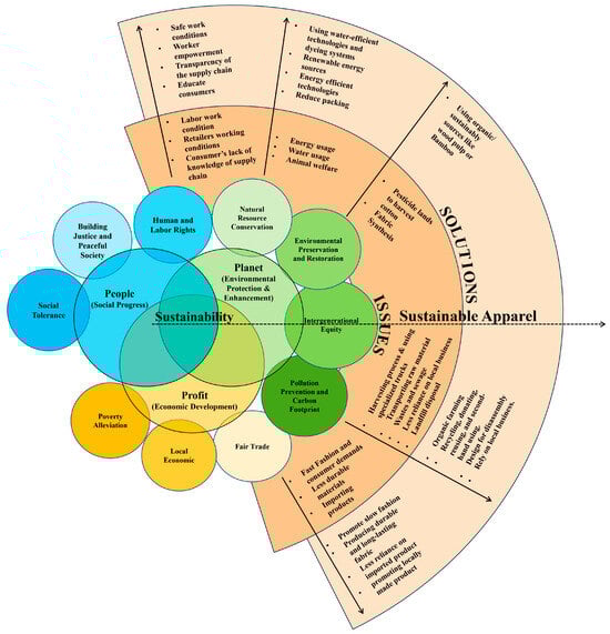 The textile and apparel industry, identified as one of the world’s most polluting sectors, is under increased scrutiny for sustainability issues, impacting the environment and social standards throughout a garment’s life cycle [15]. From fiber acquisition to disposal, the industry poses threats to the planet’s resources. The industry faces challenges in implementing sustainability within global production networks due to geographical complexity, lengthy supply chains, growing population, and the pressures of cost and lead time [16]. Ever since sustainability became a major concern for societies, many researchers studied different variables at different stages of this process to increase the apparel industry’s sustainability. By adopting TBL in the apparel and textile industry, both companies and consumers should be involved in sustainable performance [17]. The triple bottom line approach emphasizes the consideration of social and environmental performance alongside financial performance. Figure 1 elaborately illustrates how different issues of sustainable apparel are related to the three different aspects of TBL and what solutions have been offered to control their effects. While the apparel and textile industry is divided into two segments—producing textiles from raw materials and manufacturing them—the fashion industry also has another segment: selling and engaging with the consumer [18]. Hence, if the apparel industry aims to be sustainable, not only should producing textiles and manufacturing them embrace sustainability, but the fashion selling sector and consumer engagement in purchasing and after purchasing clothes, which is affected by their attitude and knowledge, should also consider sustainability, leading to a more sustainable apparel industry [17].
