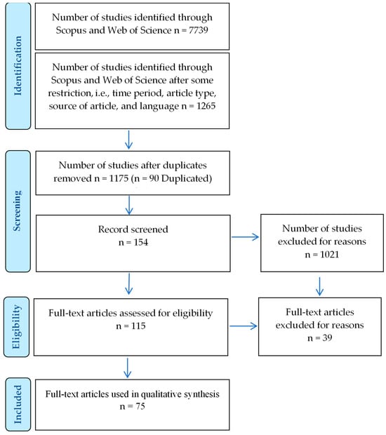 The remaining articles underwent two subsequent screening processes following the initial screening phase. First, the titles and abstracts were evaluated to identify relevance to the study’s focus. Subsequently, the entire content of the articles was screened to ensure alignment with the analysis of sustainable apparel, the primary theme of this review. This screening aimed to exclude articles that did not explicitly address sustainable apparel upon initial examination. Hence, articles not addressing sustainability AND apparel in their abstracts were withdrawn from the archive. For instance, after the abstract was assessed, the article “Prickle and handle properties of fabrics produced from specialty animal fibers” was removed from the list of articles. This article focused on material properties rather than sustainable consumption. Out of the initial pool, 154 articles proceeded to full-text screening. Among these, 39 articles were deemed unrelated to the primary focus and were consequently excluded from the dataset. The remaining 115 articles (Figure 2) were retained for thematic merging and qualitative synthesis analysis, leading to 75 articles’ inclusion.