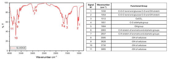 Figure 3 shows the ATR FT-IR spectrum of the sludge and the main infrared transmittance bands of the chemical components of the sludge, where the presence of characteristic cellulose signals can be observed. In particular, the stretches characteristic of the O-H bond specific to cellulose are present between 3595 cm−1 and 3865 cm−1 (peaks 8, 9, 10, and 11). Also, the peaks between 2800 cm−1 and 2937 cm−1 (peaks 6 and 7) correspond to the asymmetric stretches of the C-H bonds of the aromatic and aliphatic groups found in cellulose, hemicellulose, and lignin. The presence of cellulose is further supported by the peaks at 1054 cm−1 and 1030 cm−1 (peaks 1 and 2), corresponding to the asymmetric stretches of the C-O-C bonds present in cellulose [41,42]. The transmittance band at 1684 cm−1 (peaks 4 and 5) corresponds to the OH group likely associated with water absorbed in the sludge. Finally, peak 3 at 1512 cm−1 is characteristic of calcium carbonate, which is used in the Kraft process of cellulose production [43,44].