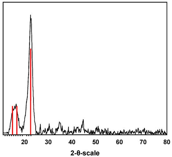 X-ray diffraction pattern of sludge sample. The red lines highlight the diffraction peaks related to the crystalline cellulose phase, as mentioned in the previous paragraph.