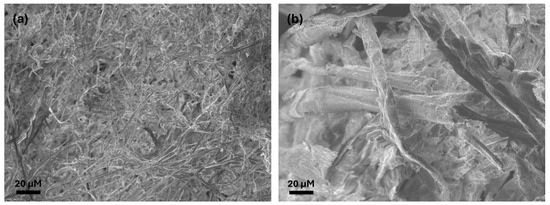SEM images of mycelium-based biomaterials using Trametes versicolor. (a) Exterior face; (b) interior face.