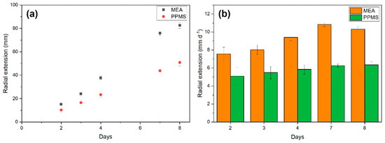 Radial extension of Trametes versicolor hyphae in MEA and PPMS. (a) Cumulative growth; (b) daily growth rate.