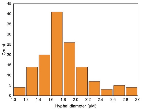 The hyphal diameter was also measured using SEM micrography and the ImageJ software. The hyphal mean diameter was close to 1.7 µm, as shown in Figure 7, higher than the hyphae diameter reported for Trametes versicolor in other substrates [49]. Thinner hyphae could affect the mechanical properties of the biomaterials, which will be evaluated in future studies.