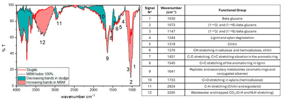 Chemical characterization of biomaterials was carried out using FT IR-ATR spectroscopy to confirm the formation of a new biomaterial. Figure 8 shows the infrared spectrum of the biomaterials using the sludge and Trametes versicolor, revealing transmittance bands that disappear and appear compared with the substrate’s infrared spectrum, as seen in Figure 8. The characteristic bands in the range between 3595 cm−1 and 3865 cm−1 can be related to the O-H bond stretching due to the presence of cellulose. The peaks between 2800 cm−1 and 2937 cm−1 correspond to the asymmetric stretching of the C-H bond of the aromatic and aliphatic groups found in cellulose, hemicellulose, and lignin. The transmittance band at 1684 cm−1 is related to the OH group of water absorbed in the sludge. The peaks at 1054 cm−1 and 1030 cm−1 correspond to cellulose’s asymmetric stretching of the C-O-C bonds [41,42].