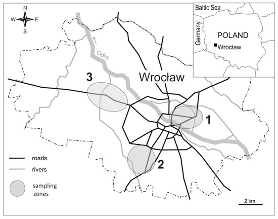 The study was carried out in Wrocław, the third largest city in Poland and the capital of Lower Silesia (Figure 1), which has over 600,000 inhabitants. Taking into account the results of previous studies [31,32,33], research sites were chosen in three parts of the city: eastern (1), southern (2) and western (3), as shown in Figure 1.