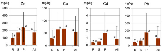 Figure 2. Metal concentrations in soils of all the study sites (All) and in the groups related to various categories of lawns (R—residential; S—street; P—parks). Columns illustrate the mean values, and error bars represent the standard deviation SD. The same lowercase letters (a) indicate a lack of significant differences (p < 0.05) between the groups of sites.