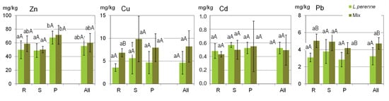 Figure 3. Ranges of metal concentrations in the biomass of ryegrass (L. perenne) and in the biomass of other components of the lawn sward (Mix) analyzed from all the sites (All) and from the various groups of lawns (R—residential; S—street; P—parks). Columns show the mean values, and the error bars represent the values of the standard deviation SD. Different lowercase and capital letters indicate significant differences (p < 0.05) between the groups of sites (R, S, P) and between L. perenne and Mix, respectively.