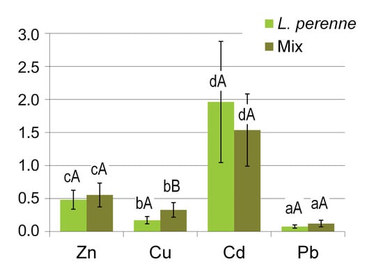 Figure 4. Bioaccumulation factors (BAFs) for various metals: a comparison of perennial ryegrass (L. perenne) with a mixture of other components of the lawn sward (Mix). Columns show the mean values, and the error bars represent the values of the standard deviation SD. Different lowercase and capital letters indicate significant differences (p < 0.05) between various metals and between L. perenne and Mix, respectively.
