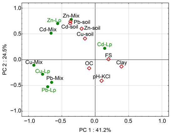 The relationships of metal concentrations in the aboveground biomass of plants and various soil factors were different for individual metals. Plant Cd and Zn showed an apparent relationship with soil contamination with these elements, which again confirms the high phytoavailability of those metals, in particular when they were present at higher concentrations in soils. In the case of Cu and Pb, unlike for Cd and Zn, it was not the concentrations of these elements in the soils, but several other factors, that mainly determined their concentrations in the aboveground biomass of ryegrass (Cu-Lp, Pb-Lp) and other plants (Cu-Mix, Pb-Mix) (Figure 5). Apparently, those factors were not statistically significantly related to soil properties. The principal component PC1, which had the greatest impact (41.2%) on the patterns of metal concentrations in the plant biomass, was not related to soil properties and should probably be attributed to plant physiology [38,42,43] or biological factors occurring in the rhizosphere [44,45,46], factors that were not analyzed in detail in this study.