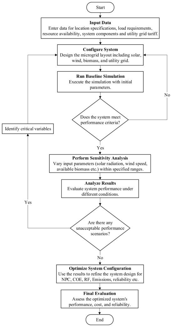 The Figure 2 flowchart explains a methodology in a HOMER Pro simulation for microgrid evaluation, incorporating location, load, resource, and tariff data. The process includes system design, baseline simulation, and performance assessment, followed by sensitivity analysis for variable inputs, and optimization focusing on cost, emissions, renewable fraction, and reliability, ensuring robust microgrid performance.
