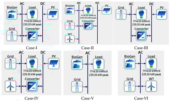 HOMER Pro software has been employed to assess the operational and economic dimensions of the proposed microgrid. Its streamlined, non-derivative optimizer allows for swift execution of numerous simulations. By discarding impractical options, it prioritizes feasible ones based on total NPC. A 25-year planning horizon is considered, with hourly time-series simulations exploring each feasible microgrid design. Seven potential cases including only grid connection as the base case were analyzed to identify the most advantageous technique for microgrid planning. Here, the sources are solar PV, wind turbine (WT), biomass generator (Biogen), and grid.