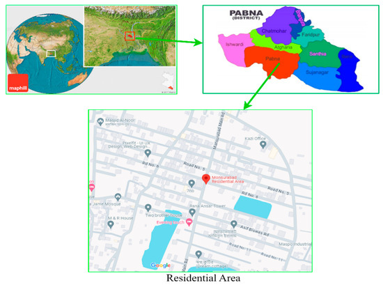 In this research, we focus on a residential area situated in Pabna, Bangladesh, specifically at the coordinates 24.00 N, 89.26 E. Residential areas are crucial for microgrid research using HOMER Pro because they represent significant, unique energy consumption patterns, which help in designing efficient, sustainable, and cost-effective distributed energy systems. Analyzing residential zones also helps in understanding demand profiles, peak usage, and potential for distributed generation, enabling more accurate simulations of the energy efficiency, cost effectiveness, and sustainability of microgrids, thereby facilitating tailored solutions for reliable and green energy supply. In the study, a residential area encompassing 61,374.8 square meters was analyzed. The area consists of 100 residential flats (units), distributed across approximately 15 buildings, with each building housing 6 units. On average, each flat accommodates five residents. Each flat is considered an individual energy consumer, resulting in a total of 100 energy consumers. The total daily energy consumption for all the flats combined is estimated at 1114.50 kWh. Figure 4 depicts the site location for our study.