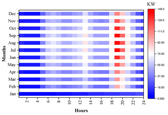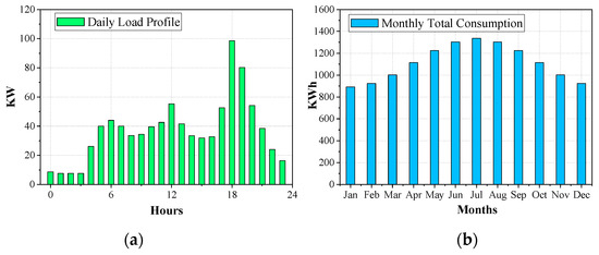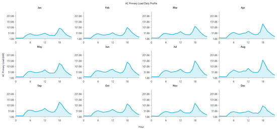 The significant element in the simulation and optimization processes is the load profile unique to each site. Facilities like educational institutions, hotels, hospitals, and industrial zones often provide actual load consumption data for simulations, inputted into HOMER as time-series data. In contrast, residential areas, remote, and rural areas lacking real consumption statistics necessitate estimated load profiles, crafted with the area’s characteristics in mind, and these estimations are then fed into HOMER as daily profiles for power balance calculations. This study examines a community with 15 buildings, comprising 100 residential units, exhibiting significant variation in peak demand across seasons and between weekdays and weekends. Despite its modest scale, the community’s peak load reaches 239.31 KW, with daily consumption of 1114.50 KWh, attributed to substantial residential loads. Daily and monthly load profiles are constructed using average statistical data from a 5-year period. Figure 5 depicts the daily and monthly load profile, Figure 6 Shows the monthly ac primary load profile, and Figure 7 shows the hourly load profile for the community.