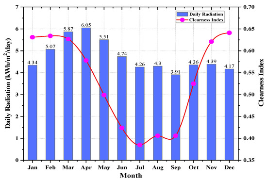 The total annual solar radiation for the recommended location is shown in Figure 8 along with a clearness index. For the site under consideration, 4.75 kWh/m2/day of yearly average irradiation is used. Solar PV output is directly influenced by solar radiation levels and clearness index. Higher solar radiation increases PV output, while clearness index, indicating atmospheric clarity, affects the efficiency of PV systems by altering the amount of sunlight reaching solar panels [40].