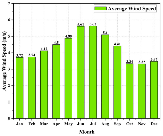 Figure 9 shows that the monthly average wind speed at the location is 4.32 m/s. Higher wind speeds can cool solar panels, increasing their efficiency [42]. Cloud cover decreases solar irradiance, reducing PV output, while wind can disperse clouds, potentially increasing solar production. On the other hand, wind speed directly influences wind turbine (WT) output; higher speeds generate more electricity or vice versa [43].