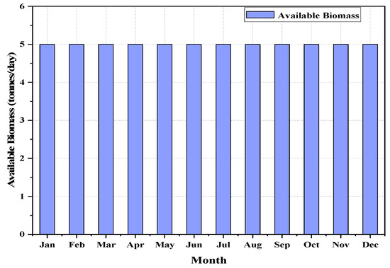 Figure 11 illustrates the daily availability of biomass resources sourced from Pabna Municipality for utilization in a biomass generator aimed at community service. Biomass generators provide a sustainable energy source by converting organic waste into electricity, offering a reliable and environmentally friendly solution to meet the energy needs of communities, especially in rural areas. Initially, 5 tons per day of biomass from municipal solid waste (MSW) is considered. However, this quantity is varied to conduct sensitivity analysis on the impact of biomass amount on electricity production and the COE.