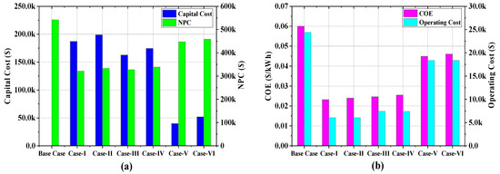 Comparison of various factors of different cases: (a) capital cost and NPC, (b) COE and operating cost.
