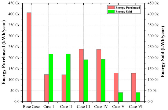 Figure 13 showcases energy procurement and sales across different configurations, with Case-I and Case-II standing out notably. While the base case relies solely on the grid without selling energy, other cases exhibit diverse patterns of energy transactions, with notable differences in purchase and sale quantities, suggesting varying degrees of self-sufficiency and renewable energy integration. Figure 13 showcases energy procurement and sales across different configurations, with Case-I and Case-II standing out notably. Despite lower energy purchases, both cases demonstrate significant energy sales, indicating potential efficiency improvements. These findings underscore the importance of optimizing energy management strategies, offering valuable insights for various applications.