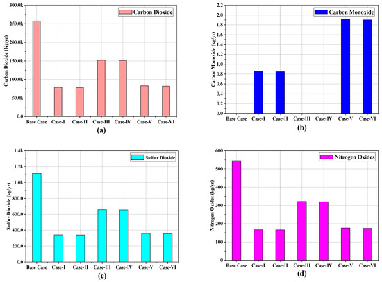 Comparison of GHG emissions of different cases: (a) carbon dioxide (kg/year), (b) carbon monoxide (kg/year), (c) sulfur dioxide (kg/year), (d) nitrogen oxide (kg/year).
