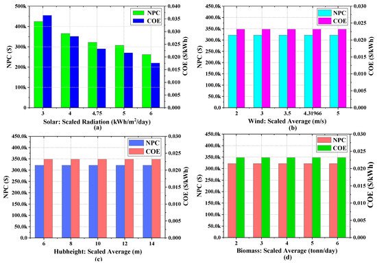 NPC and COE plots, examining impacts of sensitivity variables: (a) solar radiation, (b) wind speed, (c) hub height, and (d) biomass quantity on the microgrid system.