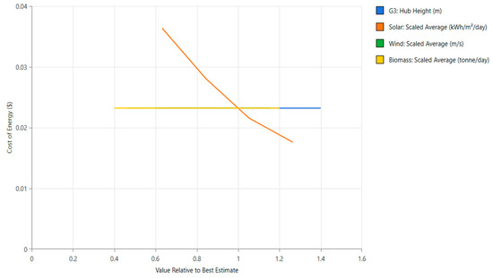 Sensitivity analysis in HOMER Pro identifies how changes in input variables affect microgrid performance, which is crucial for optimizing design and ensuring reliability under diverse conditions in hybrid systems. Table 4 presents crucial variables affecting microgrid simulations in HOMER Pro, including solar radiation, wind speed, hub height, and biomass quantity, essential for accurate energy system modeling.
