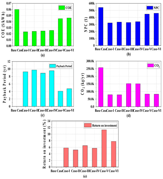 Visual comparison among cases considering different parameters: (a) COE, (b) NPC, (c) payback period, (d) CO2, (e) return on investment.