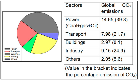 Roughly 99% of the GHG released from the vehicle’s exhaust are carbon dioxide emissions. Burning one gallon of gasoline in a conventional car can produce 8887 g of CO2, while one gallon of diesel produces roughly 10,180 g of CO2. An average passenger car produces 4.6 metric tons of CO2 annually. This figure may change, depending on a vehicle’s fuel type, fuel efficiency, and annual mileage. According to a KPMG (UK) analysis, the transportation sector is the largest emitter in the US and the UK, contributing roughly 25% and 30% of the carbon emissions from transportation worldwide, respectively [10]. Nearly a quarter of the global transportation-related emissions originate from China. In India, 90% of CO2 emissions from transportation come from the road sector. The World Economic Forum estimates that heavy-duty trucks are responsible for 25% of global road emissions, despite making up only 1% of all fleet vehicles [11]. Therefore, setting a precise goal for road transport decarbonization is very imperative. Transitioning to lower-carbon fuels, increasing fuel efficiency, and enhancing system-wide efficiency, including through the deployment of autonomous vehicles and vehicle sharing, are important decarbonization pathways for the transportation sector [12].