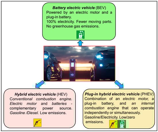 The different types of EVs available on the market are illustrated in Figure 3. Recently, Kim et al. showed that the effectiveness of battery electric vehicle (BEV) transition strategies, such as diesel vehicle phase-outs, subsidies, and a sales ban on internal combustion engine vehicles (ICEV), helps in reducing CO2 emissions and enhancing gross domestic product in Korea [24]. They argued that the existing transportation policy mix falls short of achieving carbon neutrality in the transportation sector, which requires additional measures like EV subsidies, a vehicle-kilometers-traveled tax, and a prohibition on ICEV sales.