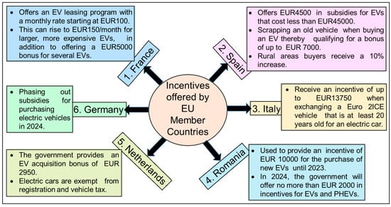 China has emerged as the leader of the EV industry; credit goes to significant advancements in battery production capabilities, charging infrastructure, and new EV model developments. Its enormous manufacturing capacity allows it to make EVs at a reduced price. At present, China is the world’s largest car market and has become the dominant EV force. According to an International Energy Agency report, more than half of the EVs on roads worldwide were found in China in 2022 [55]. As well, it accounted for 35 percent of global EV exports in 2022. The government has invested billions of dollars to help citizens purchase electric cars. Tax breaks were first introduced in 2014 and renewed multiple times. The country introduced a four-year tax break scheme for EVs and other green cars totaling CNY 520 billion (EUR 68 billion or USD 72.3 billion) in 2023 [56,57]. Furthermore, EVs will not be subject to a purchase tax for 2024 and 2025, up to CNY 30,000 (EUR 3900 or USD 4170) [58]. The exemption will be reduced to half and capped at CNY 15,000 for purchases made in 2026 and 2027, according to a statement from the Ministry of Finance [57].