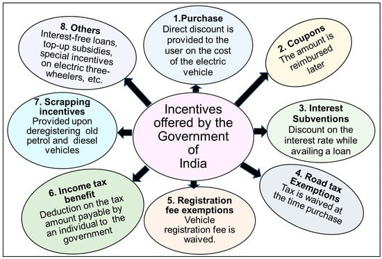 The Ministry of Heavy Industries, Government of India, reported that 1,433,545 electric vehicles (all types) out of a total of 22,717,562 were registered during the year 2023 [67]. The ratio of EVs to total vehicles is just about 0.0631. In addition, the Ministry of Heavy Industries recently unveiled the Electric Mobility Promotion Scheme 2024, which will be operative from 1 April to 31 July 2024, with a total outlay of INR 500 crores, or USD 60.3 million. The scheme provides demand incentives and subsidies to encourage faster adoption of electric two-wheelers (e-2W) and three-wheelers (e-3W) [68]. A significant boost to India’s EV industry is anticipated by some analysts from the recently established e-vehicle policy, which allows companies to set up manufacturing facilities in the country. Also, according to Reuters, the Government of India announced that it would lower import taxes on certain electric vehicles produced by carmakers that commit to investing at least USD 500 million and starting domestic manufacturing within three years [69]. The government offers various types of financial incentives to make electric vehicles more affordable, as illustrated in Figure 5 [70]. Moreover, the state-level EV targets and incentive policies for infrastructure developers and consumers offered by some major state governments in India to boost EV adoption are illustrated in Table 1.