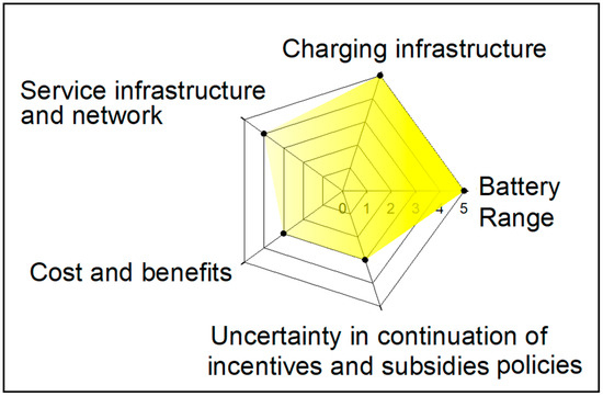 Table 5 illustrates the big challenges in the adoption of EVs in India. Poor charging infrastructure and battery range appear to be the biggest concerns for consumers [111]. Other key barriers to purchasing EVs include a lack of a universal payment system, an App for locating charging stations, poor quality of power, frequent power outages, non-operational charging stations, and long charging times [112]. Currently, EVs are more expensive than gasoline or diesel vehicles, and not many credit or suitable financial options are available. Furthermore, the absence of an EV repair and maintenance network, as well as the limited availability of skilled workers, is also hindering the growth of the EV sector [113].