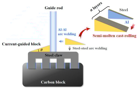 The main challenge in achieving even current density distribution stems from welding small aluminum guide rods directly onto large steel claw beams. A straightforward solution could be to shape the end of the aluminum guide rod into a triangular or trapezoidal shape to increase the contact area with the steel claw beam. However, there are significant technical and cost barriers to welding large aluminum–steel joints, making widespread industrial application impractical. Due to these limitations, this paper presents an innovative CESC with a triangular current-guided block (CGB) structure that utilizes multi-layer steel–Al composites by semi-molten cast rolling. The design of the CGB, with both aluminum and steel ends, simplifies welding by allowing for the joining of like materials, thus significantly reducing the complexity of welding. Notably, the inclusion of the CGB allows easy integration into the existing claw design without altering the current setup. By increasing the weld area, this new conductive claw design may also address the issue of weld joint cracking between the aluminum guide rod and the steel claw.
