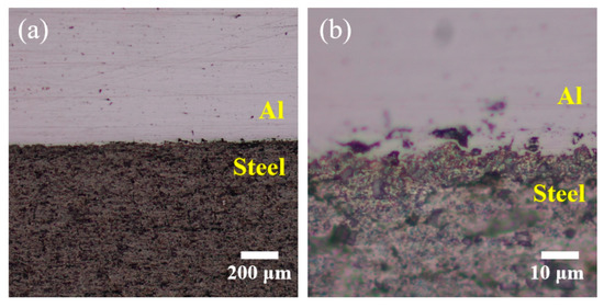 The CGB is a triangular, multi-layer composite of steel and aluminum produced by semi-solid state rolling. This advanced semi-solid state rolling technology exploits the unique microstructure and formability characteristics of metal materials in the semi-solid state temperature range, enabling efficient, near-net-shape forming of complex components with minimal forming effort [30,31,32,33]. The application of this technique is key to improving the material and performance efficiency of metals. Figure 3 displays the micro-interface of the steel–Al composite sheet crafted using the semi-solid rolling method discussed in this study. As observed, the steel layer is firmly bonded to the aluminum layer and exhibits robust mechanical strength.