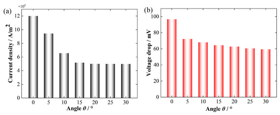Current density (a) and voltage drop (b) of CGB with different tilt angles.