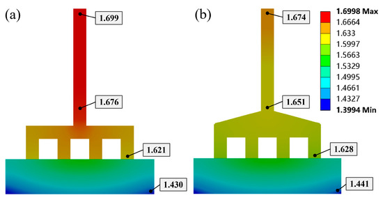 The temperature distribution on the steel claws is closely related to the stresses to which the claws are subjected. Excessive or uneven stress can lead to deformation or delamination of the claws [34,35,36]. The comparative analysis of the temperature distributions in the anode slices of the electrolysis cell using the TSC and CESC is presented in Figure 5. The results indicate that the use of CGB does not significantly affect the temperature profile of the anode carbon block and the head of the steel claw. However, a significant impact on the temperature distribution along the steel claw beam is observed. This discrepancy is due to the efficient heat dissipation of the aluminum guide rod located at the top of the explosive weld block of the TSC, as opposed to the poor heat dissipation at the bottom. As a result, there is a pronounced temperature gradient between the top and bottom sections of the block. It can also be seen that the temperature within the beam of the conventional steel claw is significantly higher than that of the CESC beam.